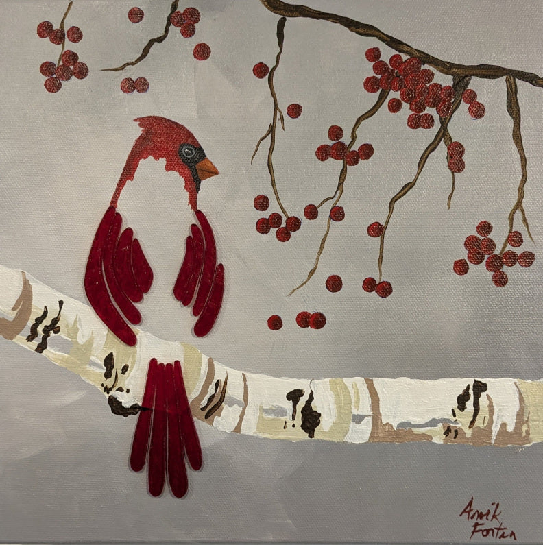 Anik Fortin Cardinal On Birch Tree 10X10 Inches